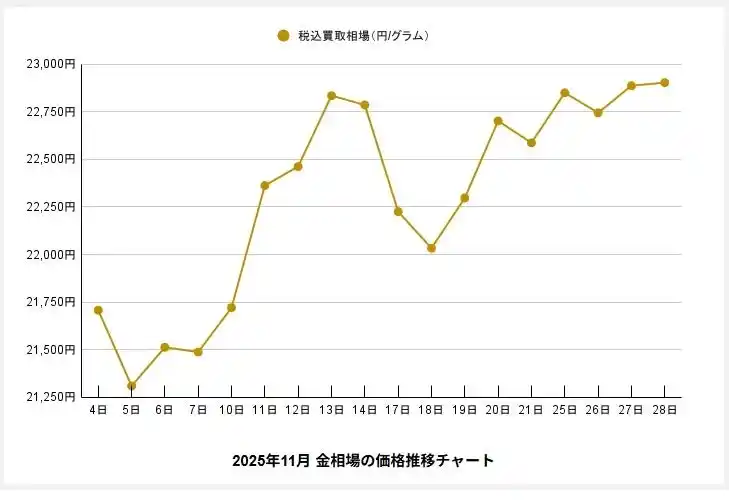 | 令和7年11月の金相場は1gあたり21,708円でスタート。9月から10月にかけて起きた金価格上昇ブームは下火となりつつありましたが、米政府機関閉鎖の長期化や利下げ政策の可能性が確実視されると金価格は再び高値を目指し始めます。11日に再び22,000円を突破。25日にはFRB理事のウォラー氏のコメントでも追加利下げの決定が正当化されることが述べられると市場の利下げ期待も上昇。米長短金利の低下は金価格の買い優先へと転じさせました。 一時期は23,000円目前となりましたが、11月最終の28日は1gあたり22,902円としました。一方、銀相場は1ヶ月で30円の上昇。プラチナに続き資産としての割安感が買いの要因となっています。1年間でおよそ2倍以上にまで相場を伸ばしている銀相場はアクセサリー類や食器などの買取増加に大きく影響を及ぼしており、知る人ぞ知る金やプラチナに隠れた第三の資産として密かに注目を集めています。 | |||||||||||||
