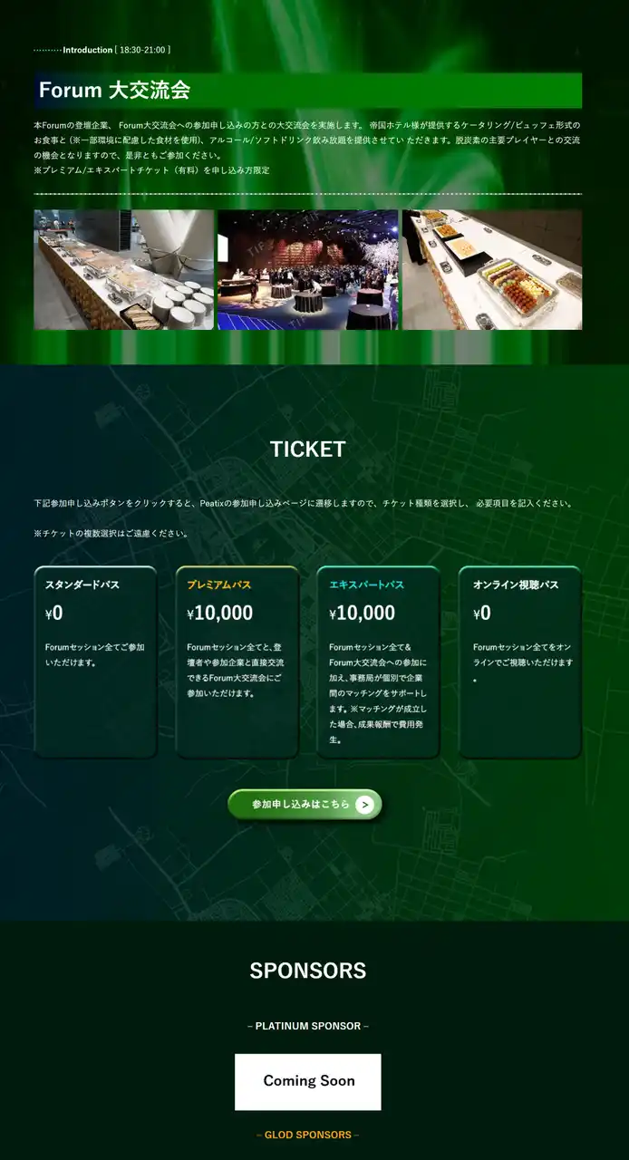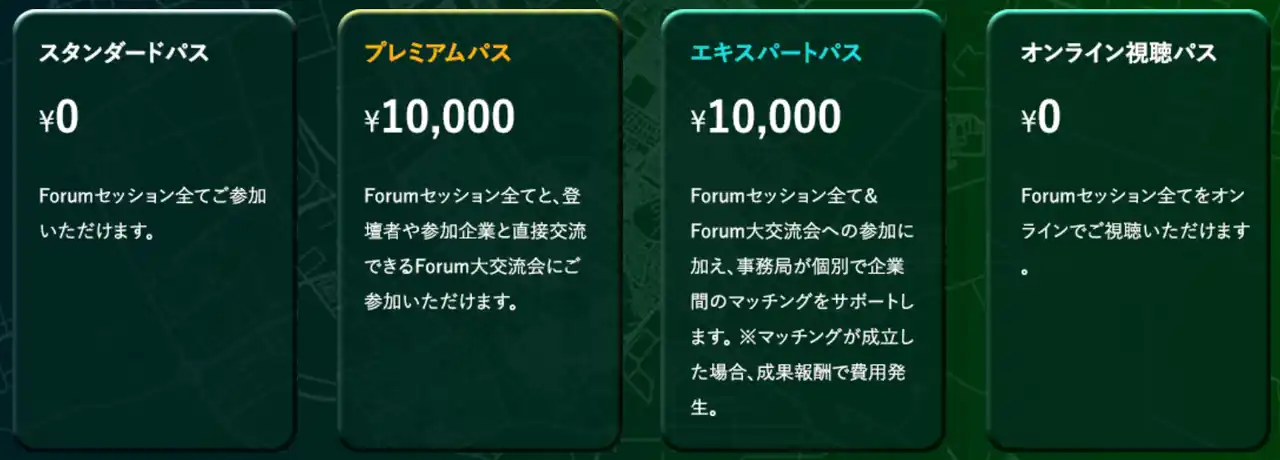 【プレミアムパス】|¥10,000 Forum全セッションと、登壇者や参加企業と直接交流できるForum大交流会への参加チケット。 ※当日領収書を発行させていただきます。 |