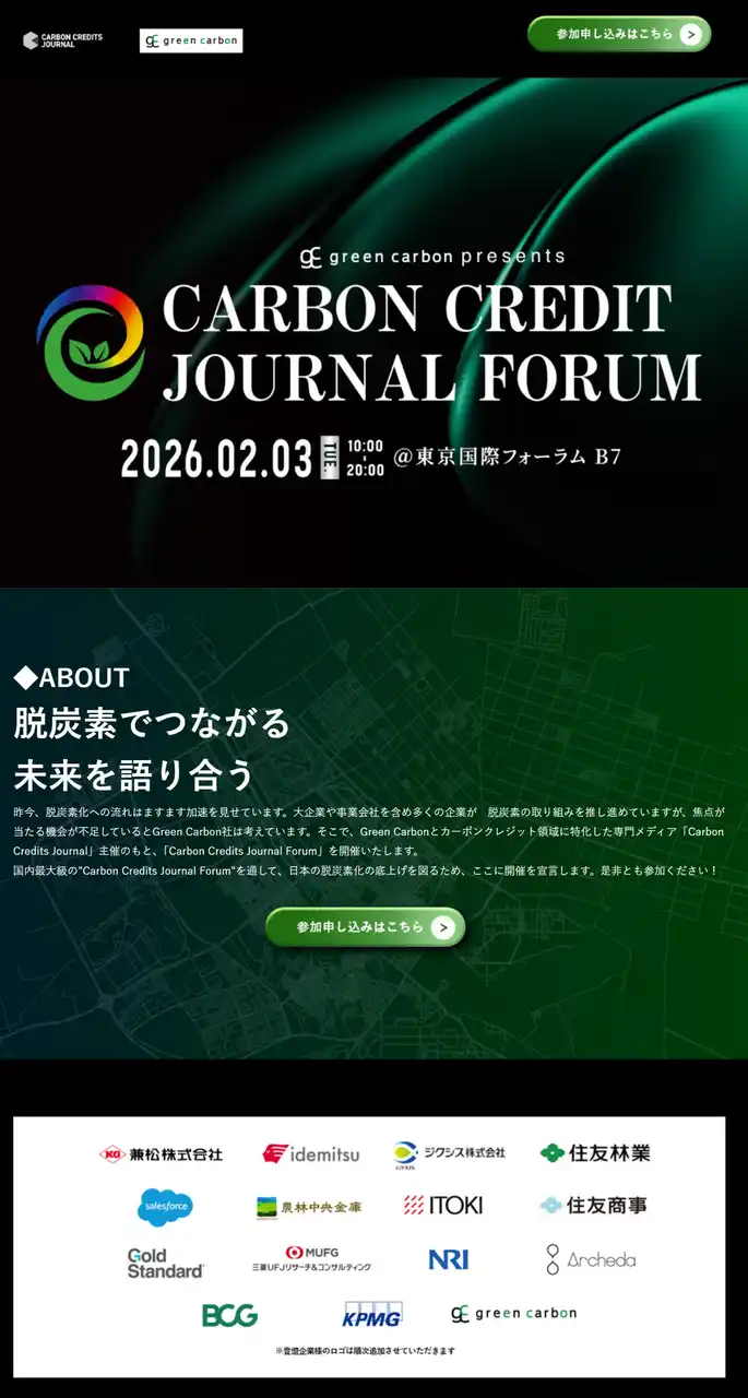ネイチャーベースのカーボンクレジット創出・販売事業を展開するGreen Carbon株式会社(代表取締役:大北潤、以下Green Carbon(グリーンカーボン))はこの度、国内最大級のカーボンクレジット特化フォーラム「Carbon Credits Journal Forum(以下、本Forum)」を、2026年2月3日(火)に東京国際フォーラムB7(有楽町駅直結)にて開催することをお知らせします。 |