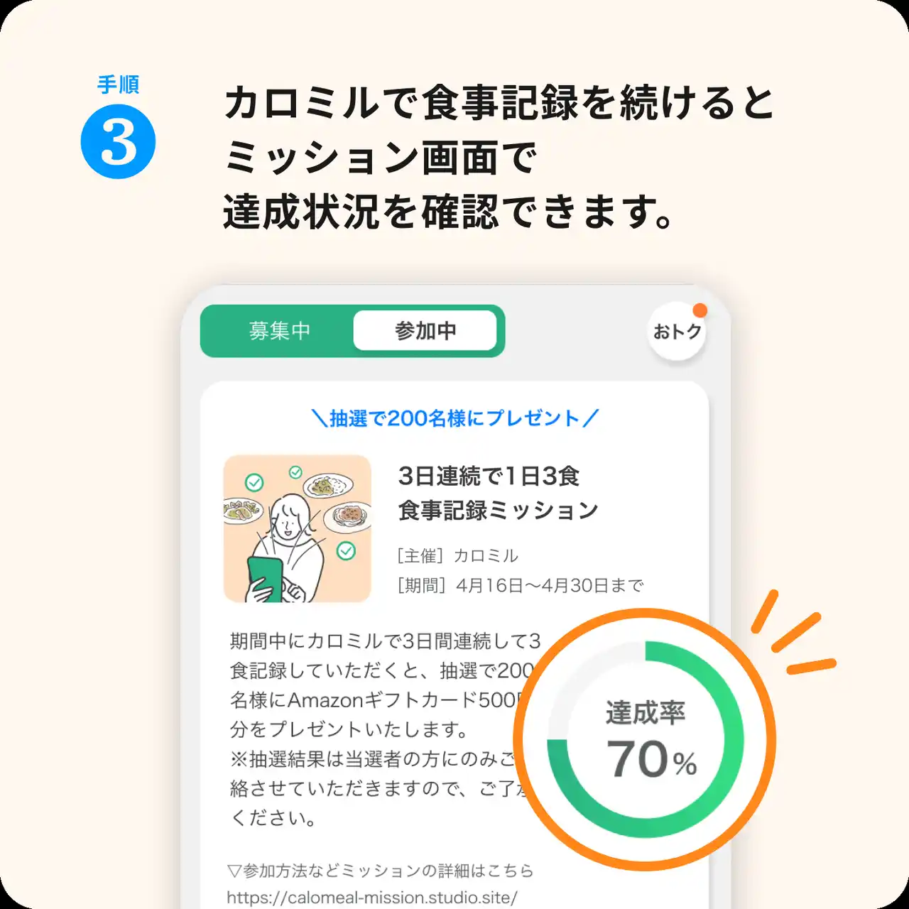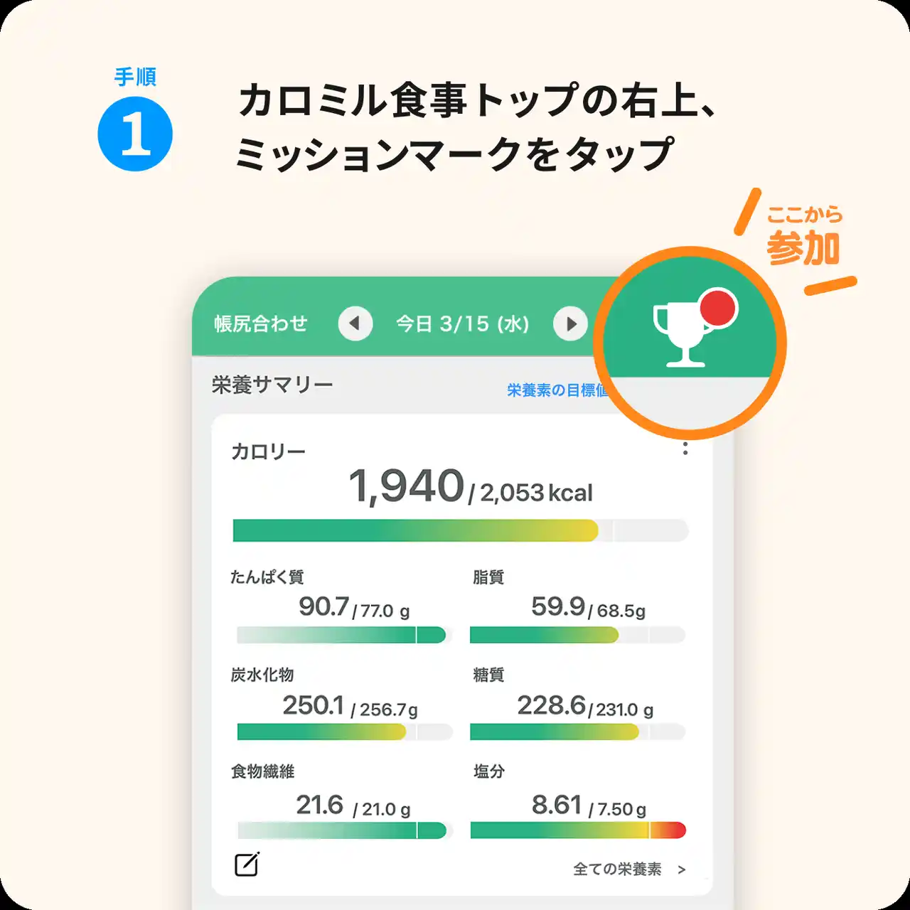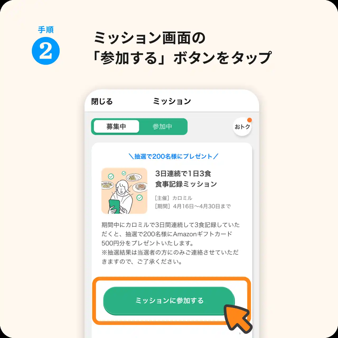 1.カロミルアプリ内のミッションより、参加ボタンをタップ |
