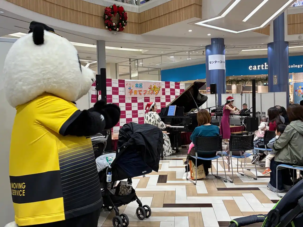 | サカイ引越センターは堺市と「子育てのまち堺」の情報発信について協定を締結しており、昨年に引き続き、フェスタのなかで「100万人のクラシックライブ」を開催致しました。望月 茉莉奈さん(ヴァイオリン)、山之内 里衣さん(ピアノ)に、子どもたちに楽しんでもらえる楽曲を演奏していただき、音楽を通じて堺市の子育て支援のお手伝いをする事ができました。会場では、まごころパンダくんが、集まった子どもたちとの記念撮影を行いました。 | ||||||||||||||