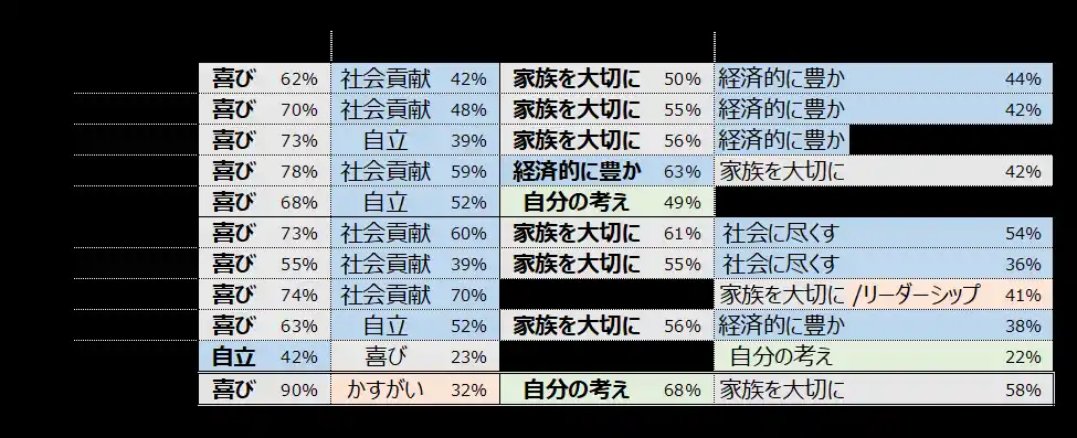 まず、表からはすべての国で「子は親の喜びである」が上位に来ており、将来への期待にも「家族を大切に」は上位にきていることから、「親にとって子は生きがいであり、家族を大切に生きてほしい」という意識は世界共通の認識であることが示唆されました。また、日本以外の多くの国では「社会貢献」や「自立」を強く認識しており、それが将来への期待の「経済的に豊か」「社会に尽くす」につながっている可能性が示唆されます。 |