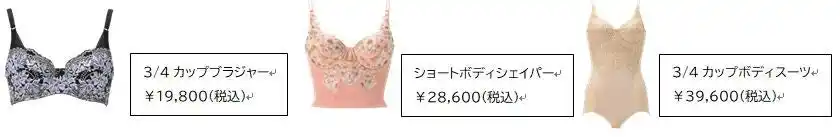 アイテム:3/4カップブラジャー、ハーフカップブラジャー、3/4カップボディスーツ(ワイヤー無)、3/4カップボディスーツ(ワイヤー入り)、ショートボディシェイパー、ガードル(裾レース・裾ヘム)、ハイウエストショートガードル、デザインショーツ、カラーバリエーションショーツ |