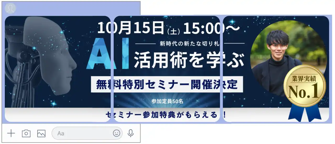 コーディング知識不要で、画像・テキスト・ボタン・動画など、テンプレートや素材を組み合わせて、手早く自由度の高いフレックスメッセージを作成できます。最大12枚のパネルを横スクロールで表示する機能も備えており、多彩な情報を効果的に伝えることが可能です。 |