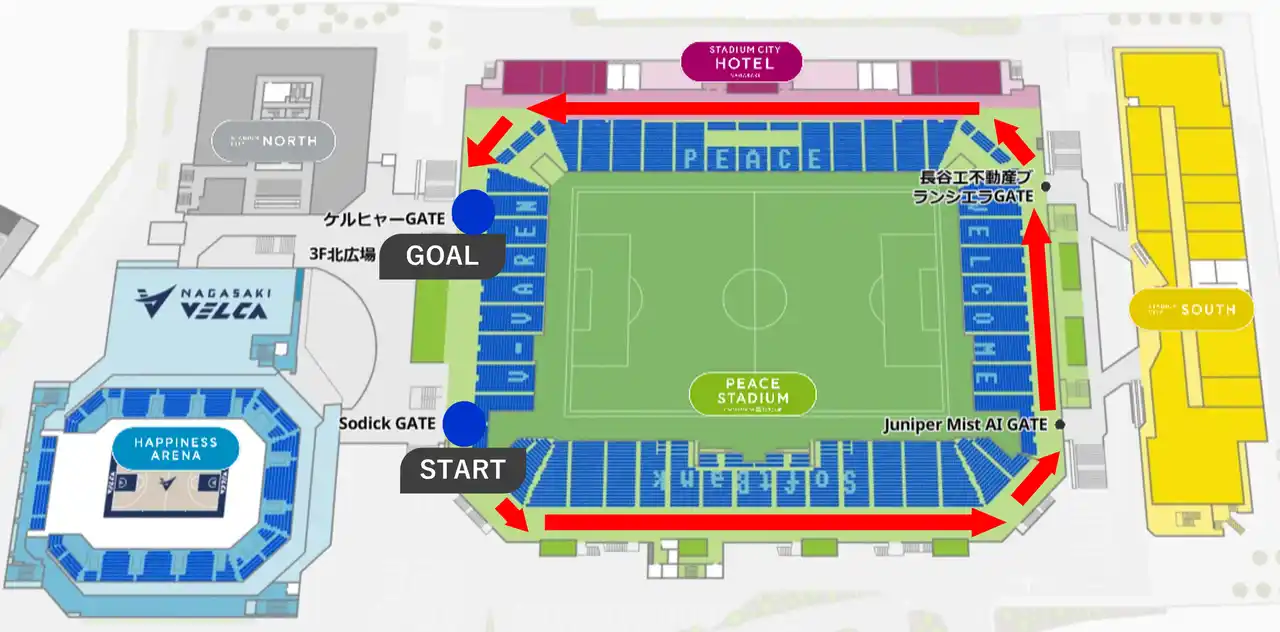 参加者は稲佐山をバックに3F「ソディックゲート」を一斉にスタート、眼下に広がる鮮やかなピッチを見ながらコンコースを駆け抜け、3F北東にある「ケルヒャーゲート」前でゴールを切ります。 |