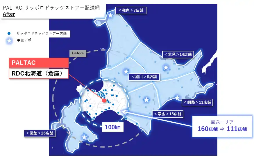 道内192店舗のうち約80%(160店舗)は、PALTACの拠点(RDC北海道)から直送していましたが、佐川急便の拠点などをデポとして活用することで移動距離を短縮しました。 |