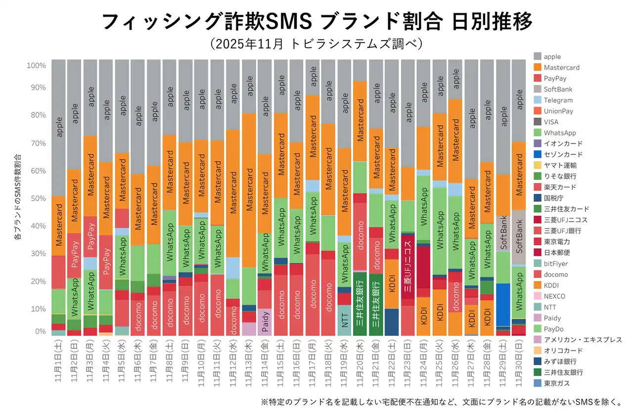実在する企業やブランドをかたるSMSについて、2025年11月は「Apple」をかたるSMSが急増し、1か月を通じて発生が確認されました。通信事業者をかたる手口については、「docomo」をかたるSMSが多発しました。クレジットカード会社「Mastercard」や、メッセージアプリ「WhatsApp」をかたるSMSは、前月に引き続き多発が続いています。 |