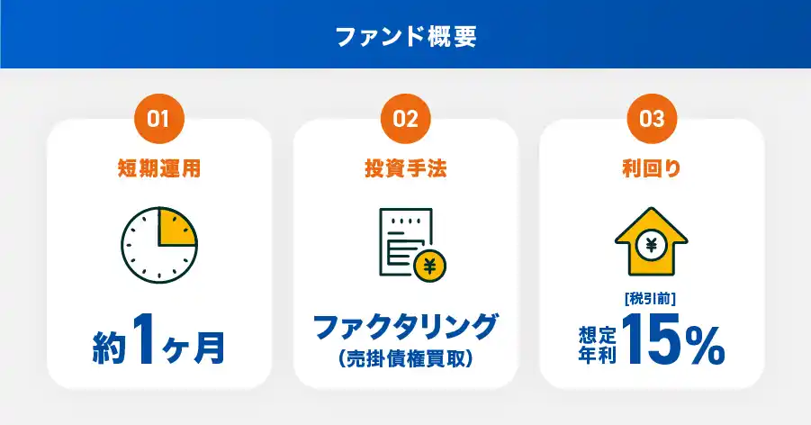 支払予定日があらかじめ決められている取引を対象とすることで、運用期間約1ヶ月の短期設計を実現しています。 |