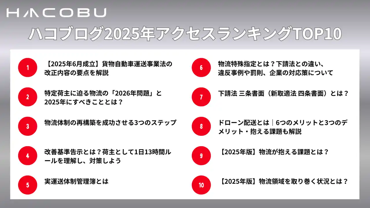 | データの力で物流課題を解決する株式会社Hacobuは、運営する物流業務改善メディア「ハコブログ」における、2025年の年アクセスランキングTOP10を発表します。上位10記事のうち6記事が法規制・法改正に関連する記事となり、物流領域における法対応への関心の高さが浮き彫りになりました。 | |||||||||