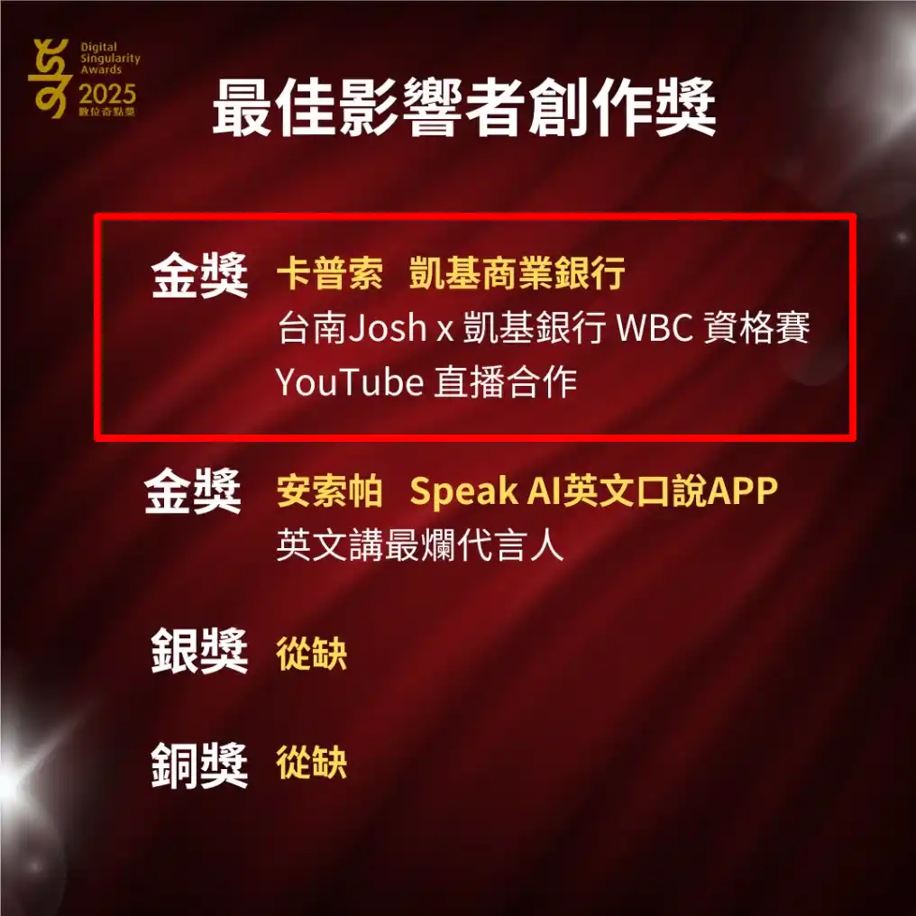 カプセルジャパン株式会社(本社:福岡県福岡市、代表取締役:埴渕修世)の台湾子会社である、卡普索股份有限公司(本社:台北市松山区、代表取締役:埴渕修世、以下両社をあわせて「CAPSULE」という)は、台湾デジタルメディア協会(DMA)が主催する「2025 デジタル・シンギュラリティ・アワード(數位奇點獎/Digital Singularity Awards、以下「DSA」)」において、凱基銀行と実施したキャンペーンが評価され、「インフルエンサーマーケティング部門|ベストインフルエンサー・クリエイション賞」の金賞を受賞いたしました。 |