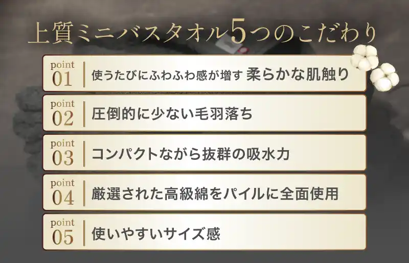 ■上質ミニバスタオルの5つのこだわりポイント |