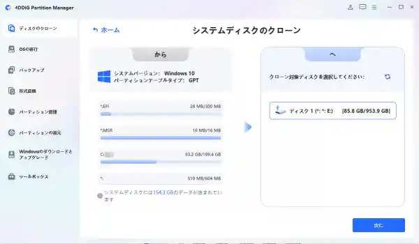 4DDiG Partition Manager は、HDD から SSD へのクローン作成に対応した無料ツールです。Windows OS を再インストールすることなく、現在の環境をそのまま新しい SSD に移行できます。操作もシンプルで、数ステップの手順だけでクローン作成が完了するため、初心者の方にもおすすめです。