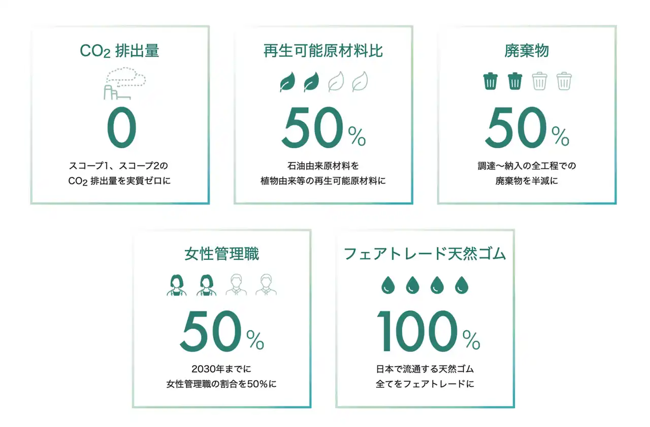 天然ゴムにも強制労働や不当取引等の懸念があることを知ってもらい、日本の天然ゴム製品を全てフェアトレード化することを目標に、自社監査により、当社調達の天然ゴムがフェアトレードであることを証明、表明し、同条件で他社も使用できるフェアトレード天然ゴムマークを作成、公開。 |
