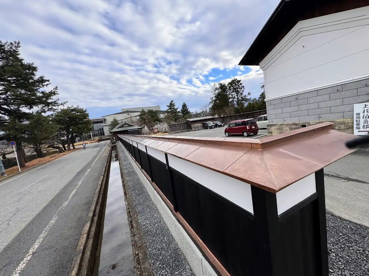 銅板は、完成直後は明るい銅色ですが、年月とともに風合いが変化し、やがて緑青が現れます。時間の経過とともに景観に溶け込み、城下町の風景として成熟していくことも、この塀の特徴のひとつです。 |
