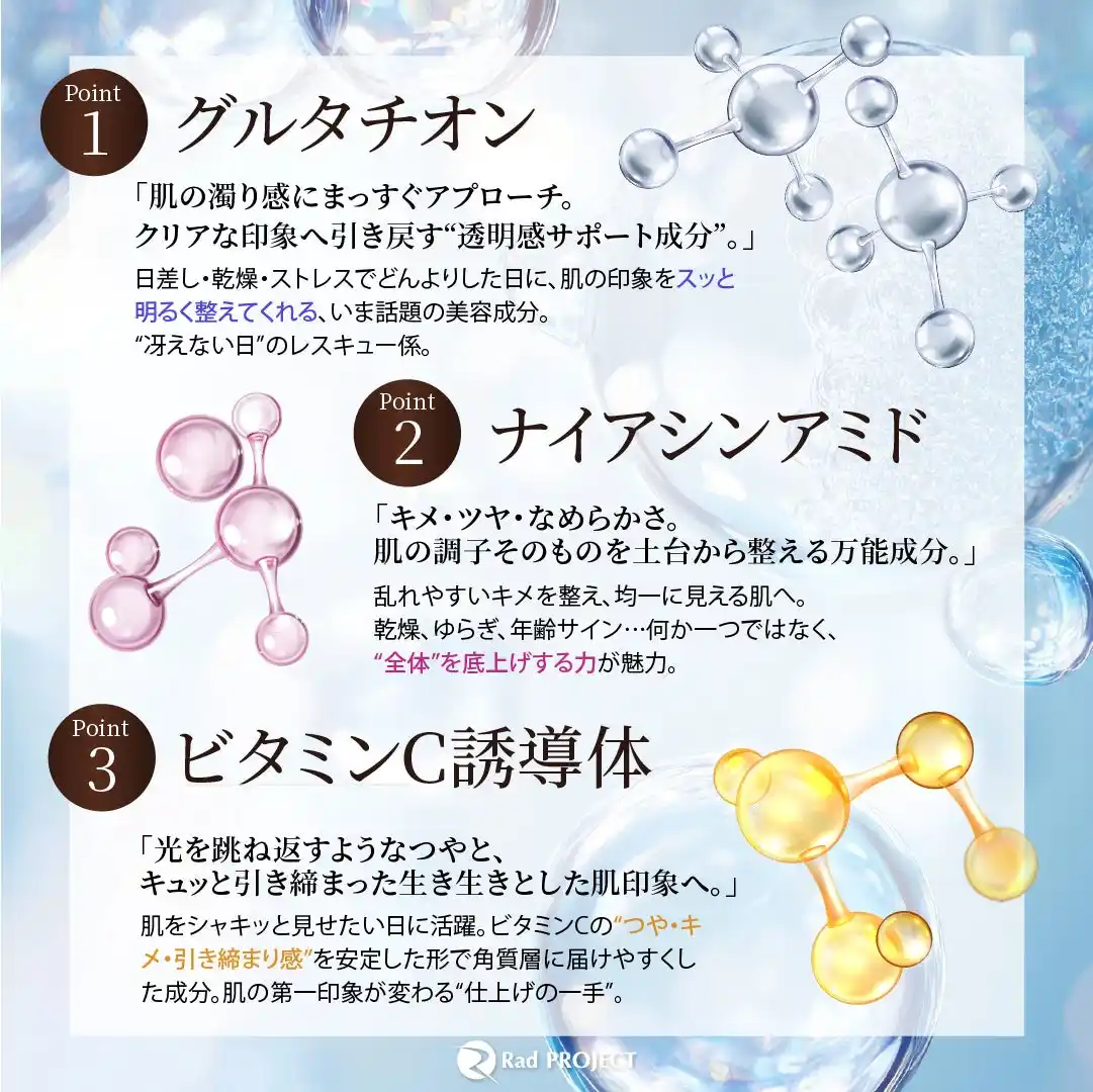| グルタチオン単体ではなく、“肌質そのものを整える”ための複合処方を採用。 | ||||