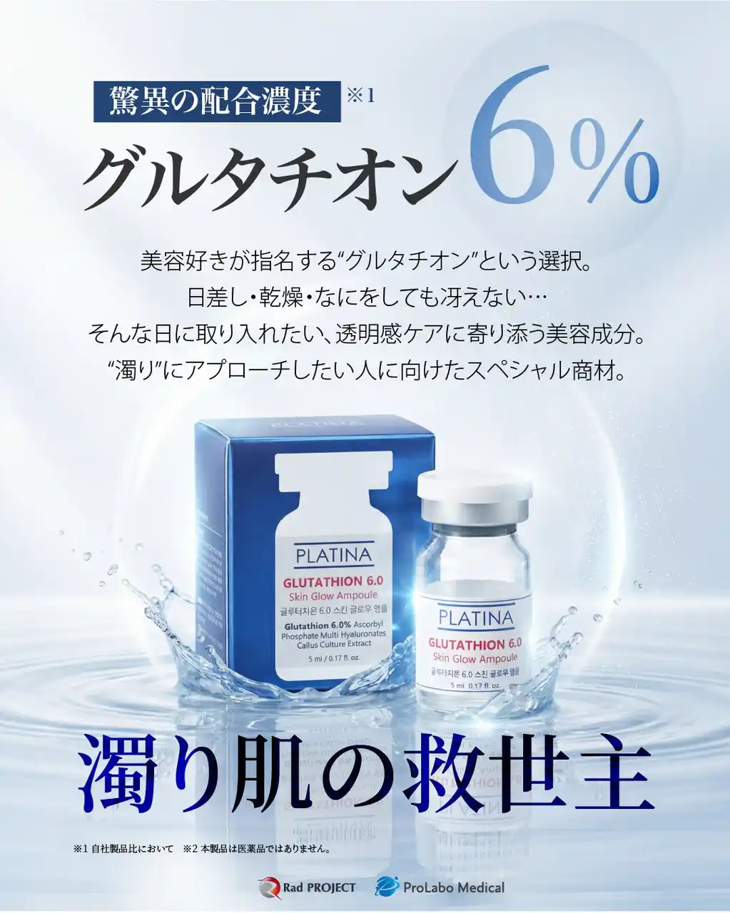 株式会社Rad PROJECT(本社:東京都渋谷区、代表取締役:瀧澤 周)は、韓国の美容クリニックにおいて実際に使用されている高濃度グルタチオン6%(60,000ppm)配合の医療美容用アンプル 「PLATINA Glutathione Skin Glow 6.0」 の日本展開を開始いたしました。 |