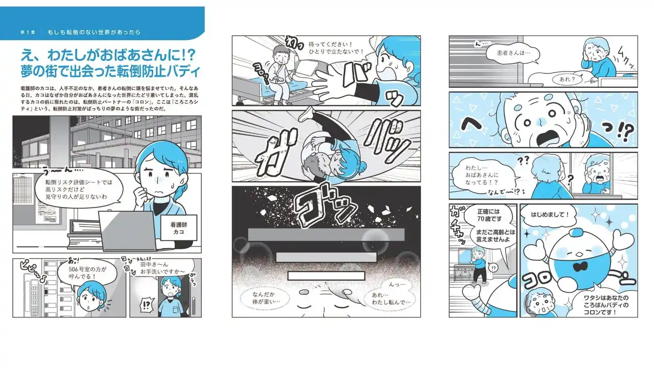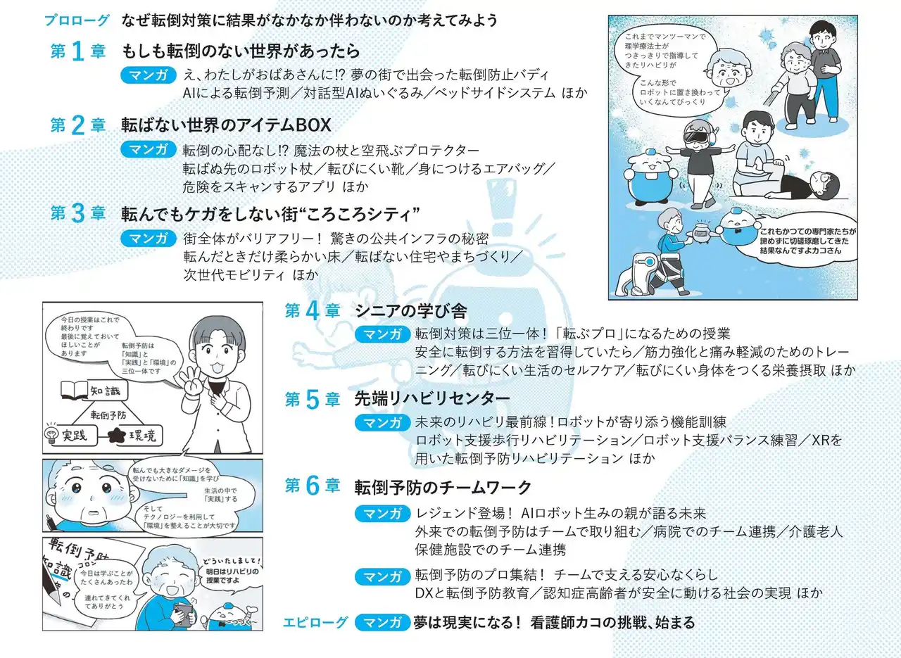 本書は、専門的な内容をわかりやすく伝えるため、マンガのストーリーを追うことで、読者が未来の転倒対策の世界を疑似体験できるようにしています。 |