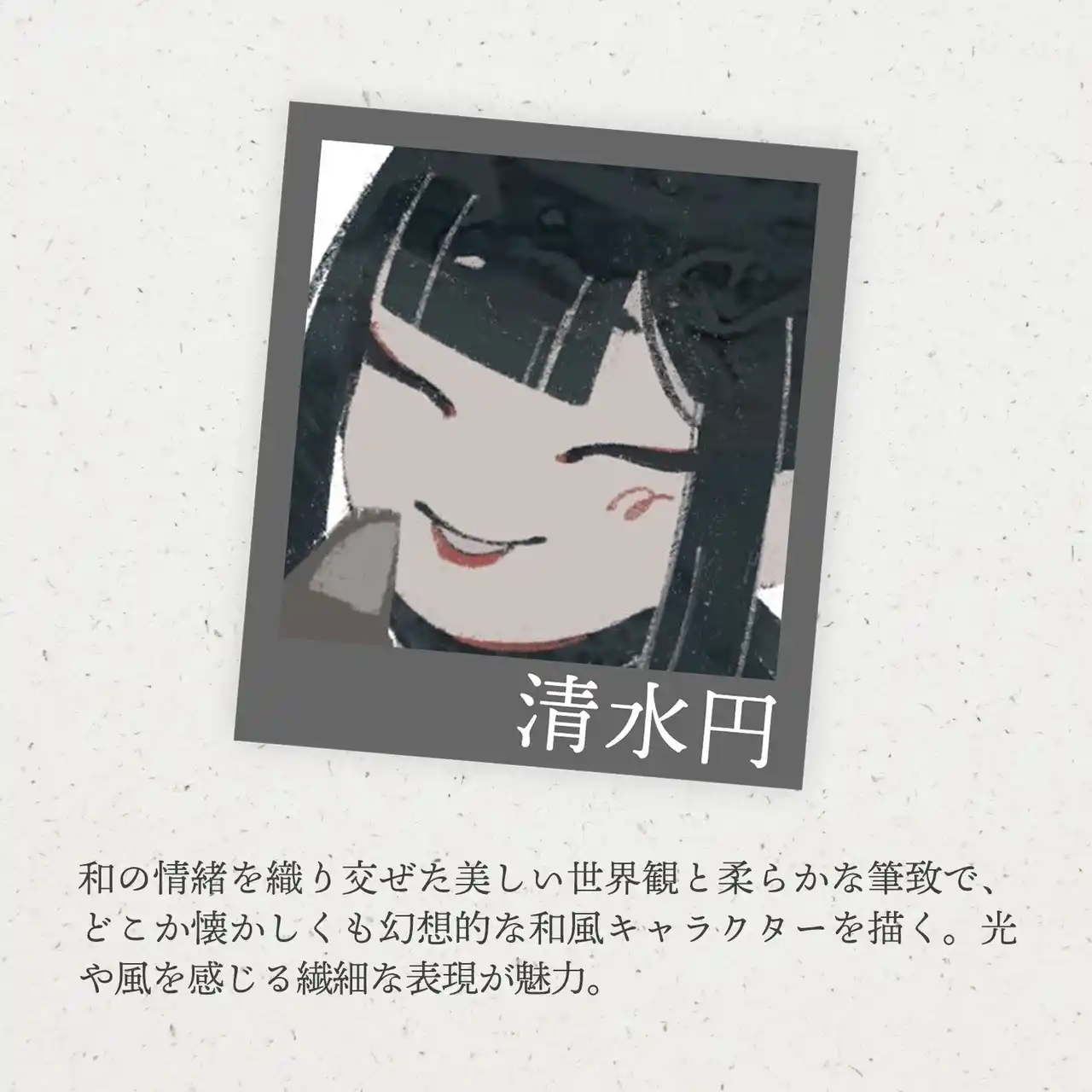 和の情緒を織り交ぜた美しい世界観と柔らかな筆致で、どこか懐かしくも幻想的な和風キャラクターを描く。光や風を感じる繊細な表現が魅力。 |