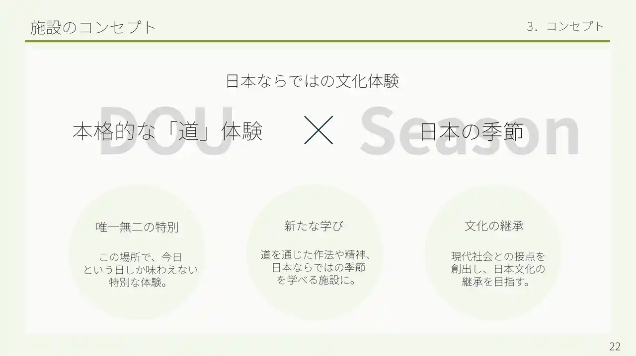 浜松町エリアが有する国際的なMICE拠点としてのポテンシャルに着目し、報奨旅行で訪日する外国人を主なターゲットとした文化体験施設「季和苑」を提案しました。弓道や茶道といった日本文化に根付く「道」と、日本ならではの四季を掛け合わせた体験設計により、滞在時間の伸長や記憶に残る高付加価値な体験創出につながる点が高く評価されました。 |