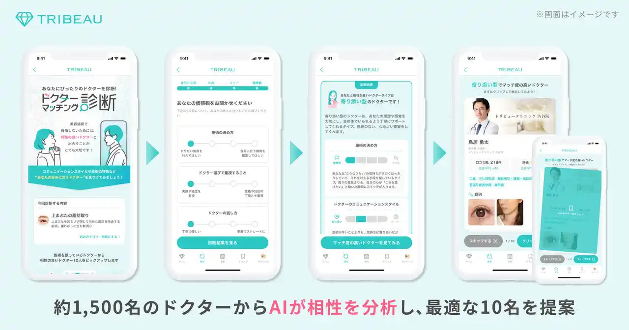 国内最大級の美容医療口コミ・予約アプリ『トリビュー』を開発・運営する、株式会社トリビュー(本社:東京都渋谷区、代表取締役:⽑迪、以下 当社)は、2025年12月25日、新機能「ドクターマッチング診断」の正式提供を開始しました。本機能は、これまでに蓄積された口コミの内容・評価・件数に加え、ユーザー自身の価値観や重視ポイントをAIが解析することで、施術におけるコミュニケーションスタイルや症例傾向など、多面的な観点から“相性の良いドクター”を診断・提案するものです。“自分に本当に合うドクターと出会える体験”の提供を通して、美容外科領域における比較検討ハードルを下げ、より多くの人々が「ありたい自分」でいられる世界の実現を目指します。 |