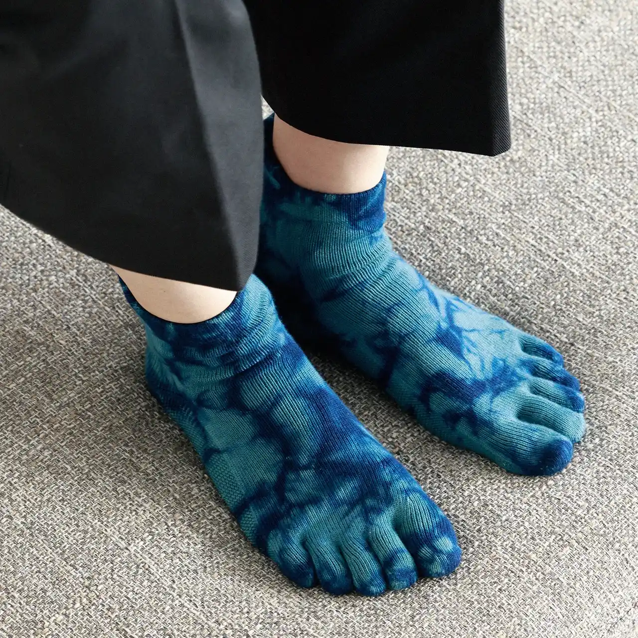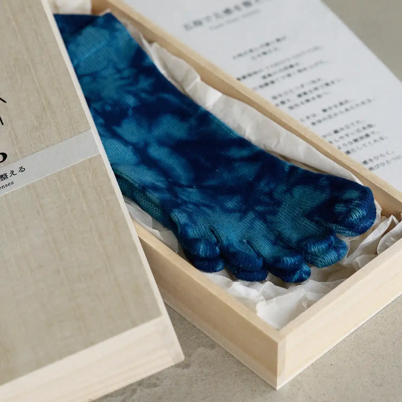 無農薬栽培のTABIO'S COTTONを、徳島の天然藍の灰汁発酵建て(あくはっこうだて)で深く染め上げ、脱ぎ履きしやすいように緩やかに編み立てた五本指ソックスです。 |