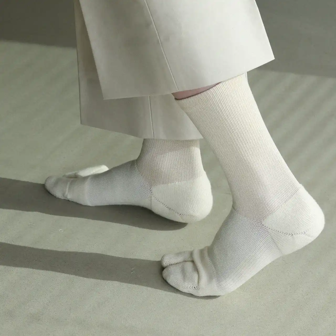 ほどよい着圧感のあるボディ部にはシルク、衝撃を和らげるクッションパイル仕様のつま先とかかとにはメリノウールという、ハイブリッドでハイスペックな足袋ソックスです。 |