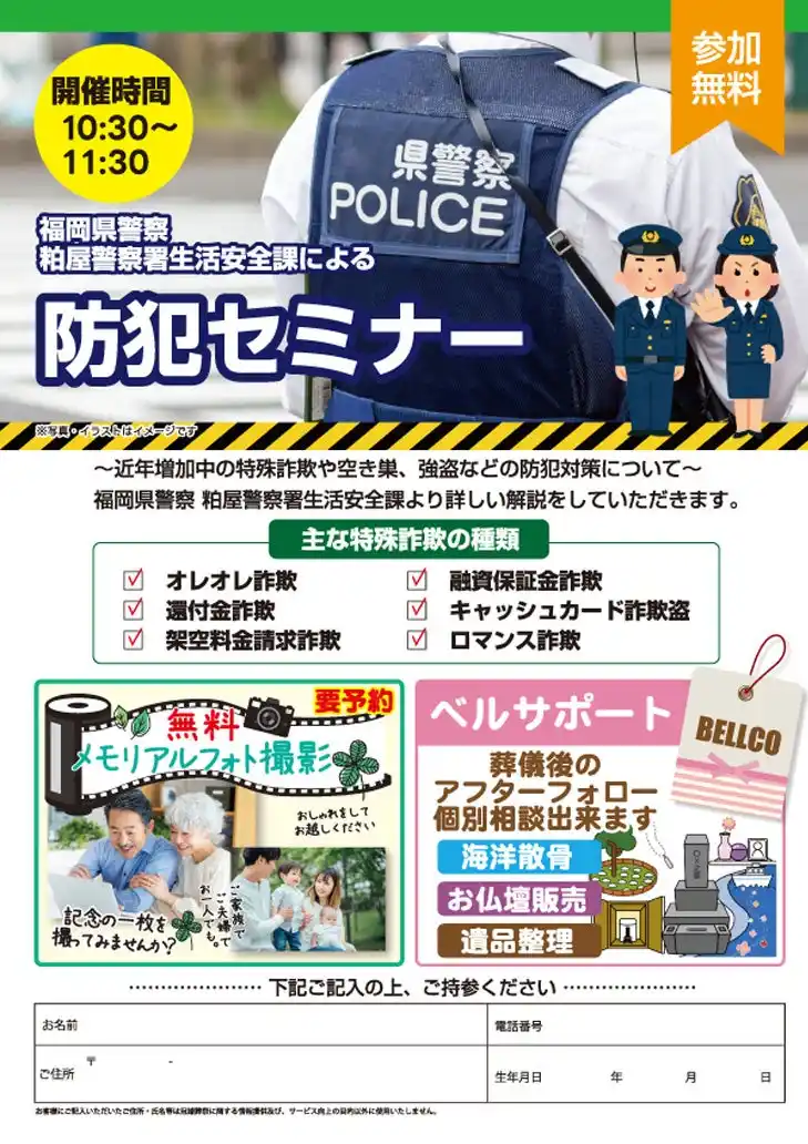 冠婚葬祭サービスを通じて地域に寄り添う株式会社ベルコは、地域住民の皆さまの安心・安全な暮らしを支援する取り組みとして、福岡県警察 粕屋警察署生活安全課による防犯セミナーを開催いたします。 |