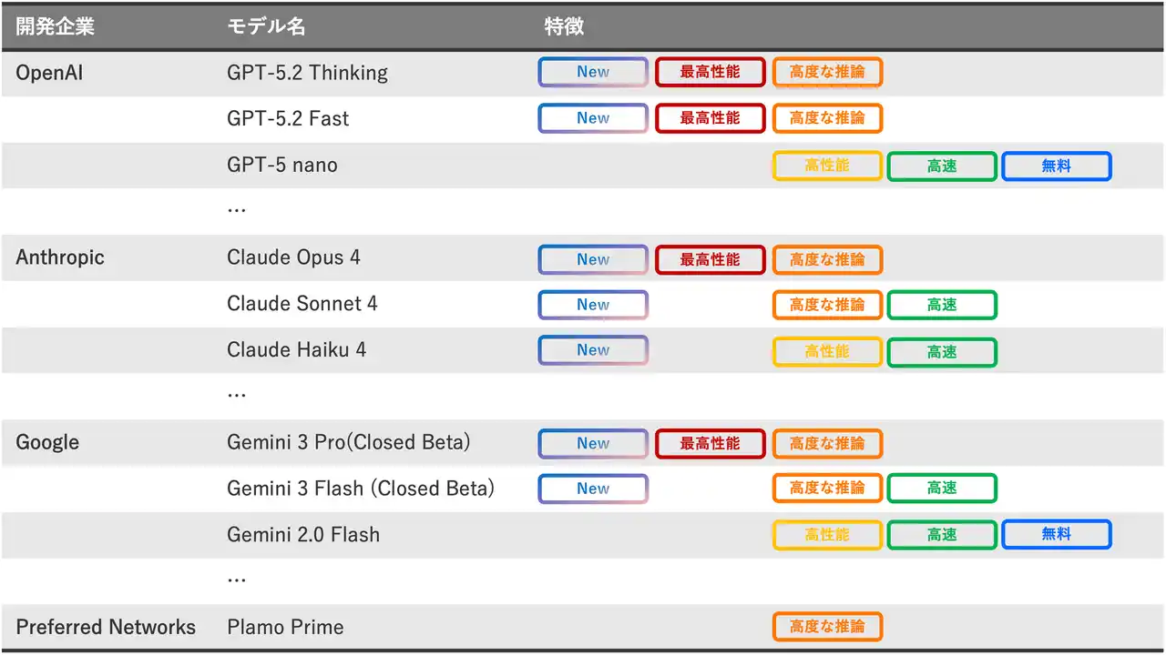 例えば、極めて高度な専門知識や推論を伴う処理には「GPT-5.2 Thinking」「Claude Opus 4.5」「Gemini 3 Pro」、速度とコスト効率を両立した大量処理には「Gemini 3 Flash」、高精度なビジネスライティングや翻訳を行うには「Claude Sonnet 4.5」など、各種LLMの長所を活かした柔軟な活用が可能となります。 |
