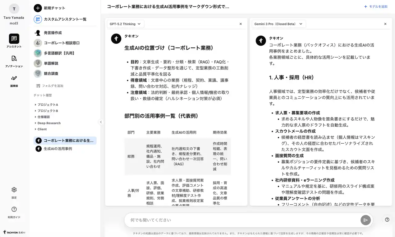 モデル比較機能を用いて複数LLMから同時生成した「Tachyon 生成AI」の操作画面 |