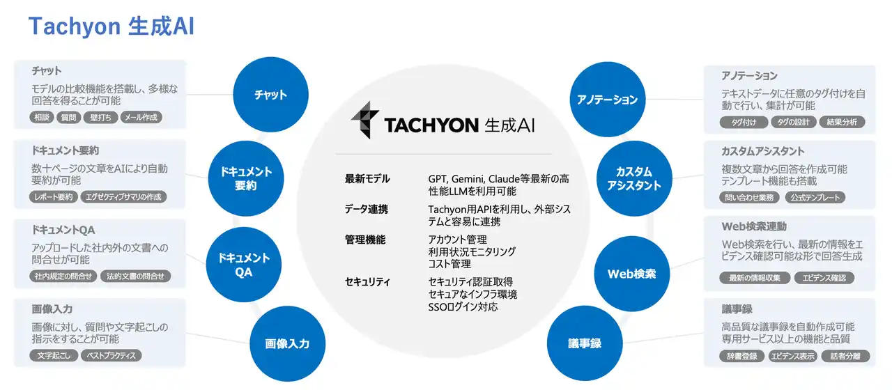「Tachyon 生成AI」では、OpenAI社が開発する「GPTシリーズ」、Google社開発「Geminiシリーズ」、Anthropic社開発「Claudeシリーズ」、Preferred Elements社開発「PLaMo Prime」を搭載しています。 |