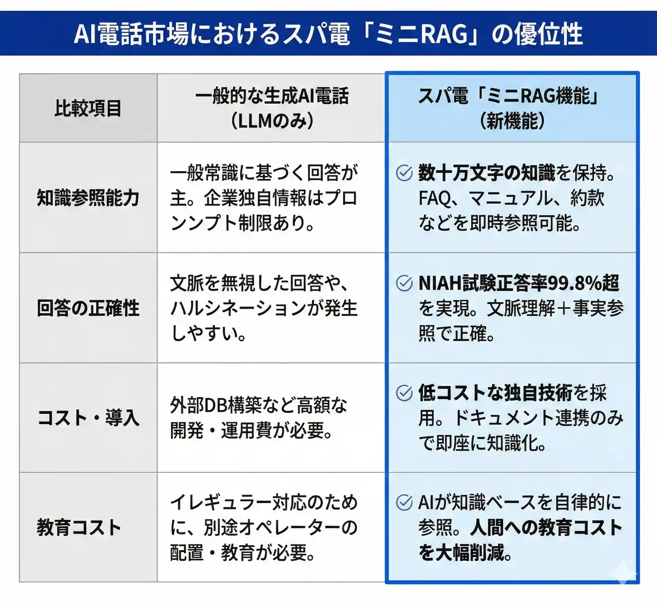 カイタク株式会社(本社:東京都新宿区 中町19-6/代表取締役:松木友範)は、電話業務向けAIソリューション「スパ電」において、コールセンター責任者が直面する「教育・属人化・品質ばらつき」課題を根本から解決する新機能「ミニRAG」を、2025年12月16日より提供開始いたしました。 |