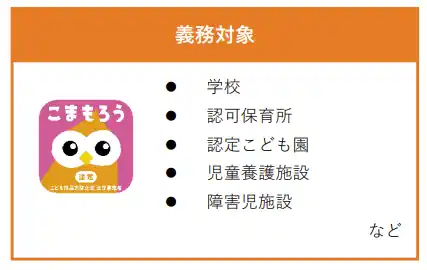 学校や認可保育所等の公的な施設は必ずこうした取組を行うこととなり、学習塾やスポーツクラブ等の民間事業者についても、国の定める基準を満たし、認定を受けることで同様の取組を実施することとなります。これらの施設・事業者は「こまもろう」マークを表示することができ、こどもを性暴力から守るための取組を適切に行う施設・事業者であると、こどもや保護者から一目でわかるようになります。 |