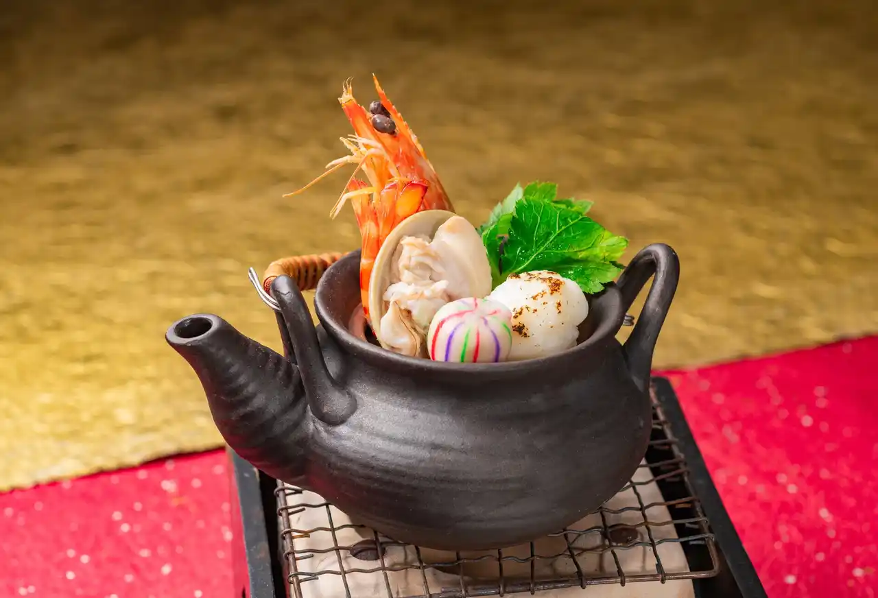 福焼白子・蛤・車海老の土瓶仕立て |