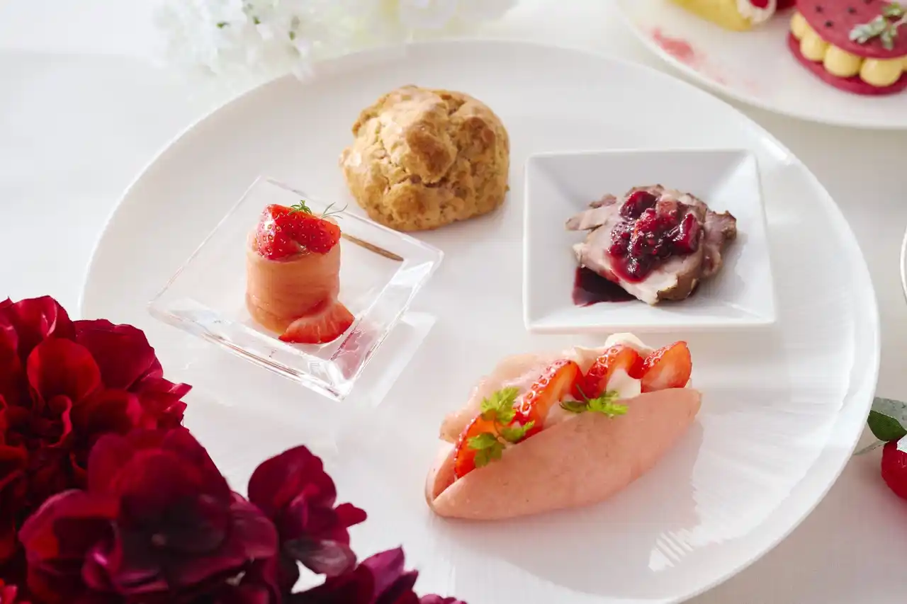 スイーツは、苺のかたちをかたどった「苺のバターサンド」や「苺のムース」、カスタードや苺のマリネ、ジュレが繊細に重なった「苺のミルフィーユ」など味わい豊富な7品を取り揃えます。セイヴォリーは、苺を使ったピンク色のパンが愛らしい「苺と生ハムとマスカルポーネチーズのコッペパン」や、「ハニーローストポーク ベリーソース」など、苺をアクセントに趣向をこらした品々をお楽しみいただけます。 |