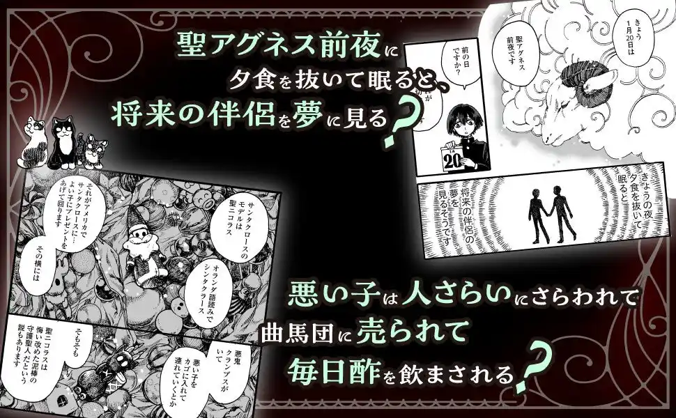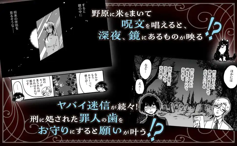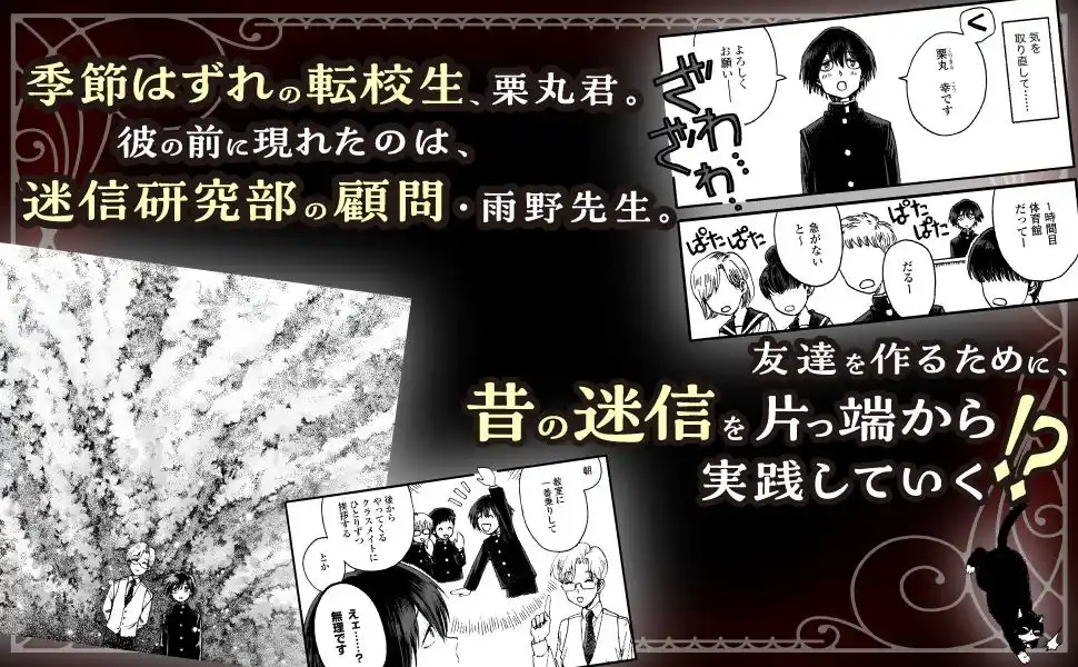 季節外れの転校生・栗丸君。ミステリアスな雰囲気を放つ雨野先生の誘いで、西洋に古くから伝わる迷信や伝承を現代日本で実践してみようという奇妙な部活動「迷信研究部」に入部することに。「クリスマスツリーを2月2日までに片付けないとゴブリンになる」、「1月20日の前夜に夕食を抜いて眠ると、将来の伴侶を夢に見る」などなど、不思議で奇妙だが、当時は皆が真剣に信じていた伝承を実践していく。 |