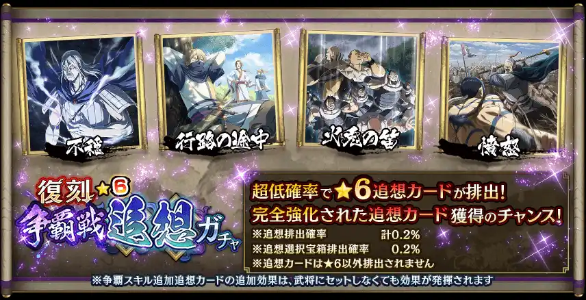 獲得することで対象武将に争覇スキルが解放される『争覇スキル追加追想カード』が排出されます! |