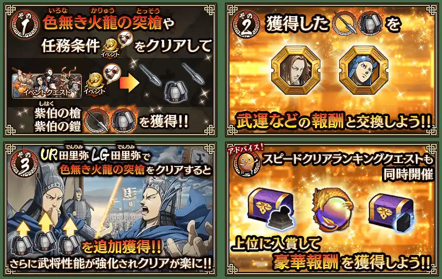 開催中のイベント『魏火の鋭槍』のイベントクエストに、『田里弥』を編成すると、交換用アイテムが追加でドロップ!報酬アイテムへの交換が容易になります! |