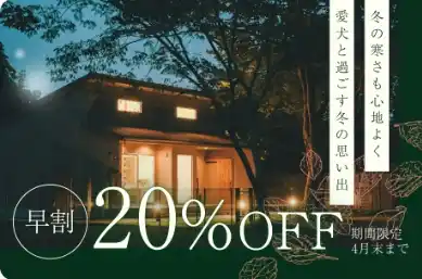 〈12月~4月末・期間限定/20%OFF〉 お早めにご予約いただくお客様のための、冬季限定の特別優待プラン。 冬の冷たい空気が澄み渡り、自然の静寂がより深まる季節は、愛犬と向き合う時間を豊かにしてくれます。 広大なプライベートドッグランでのびのびと遊び、あたたかい室内でくつろぐ── そんな穏やかな冬旅を通常よりお得な料金でお楽しみいただけます。 計画的に冬旅を楽しみたい方へおすすめのプランです。 |