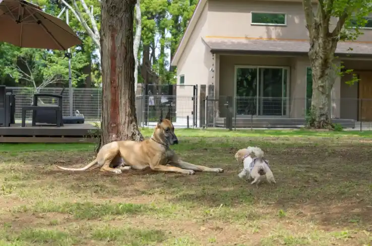 敷地全体は安全に配慮したフェンスで囲われており、 ノーリードでも周囲を気にせず自由に過ごせるのが大きな魅力。 敷地内には豊かな木々が点在し、木陰で休んだり、お気に入りの枝を探して遊んだりと、自然の中でのびのびとした時間をお楽しみいただけます。 |