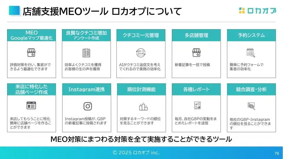 最後に、日々の店舗運営の中でGoogleマップやSNSを継続的に活用していくための手段として、ロカオプが提供する各種支援ツールについても紹介されました。 |