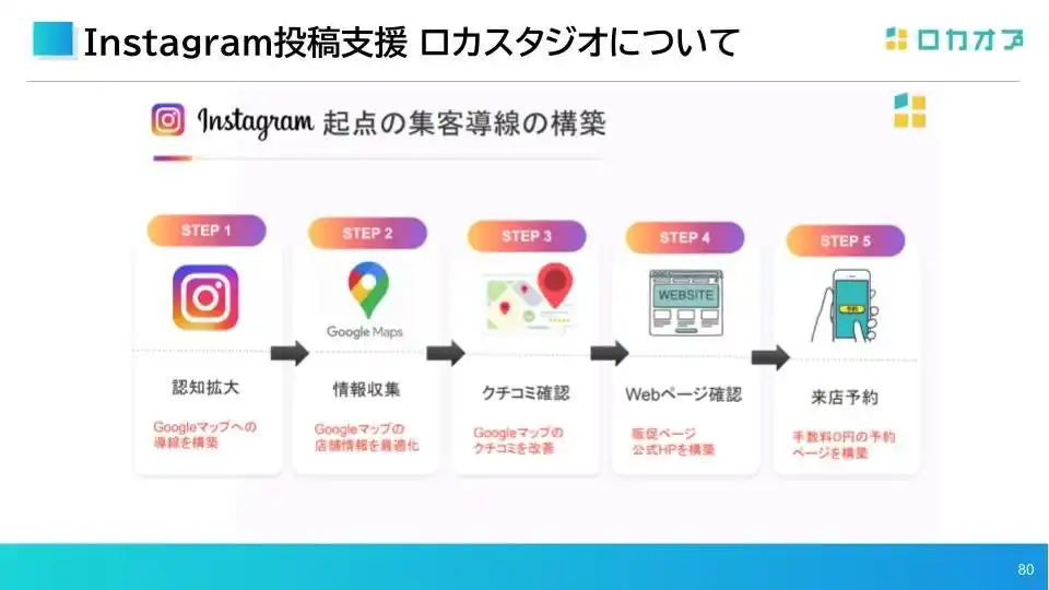 セミナーでは、GoogleマップとInstagramをそれぞれ単体で考えるのではなく、ロカオプとロカスタジオを活用しながら、日常業務の中で両者を連動させて運用していく視点が示されました。集客施策を「一時的な取り組み」で終わらせず、継続的に改善していくための選択肢として紹介されています。 |