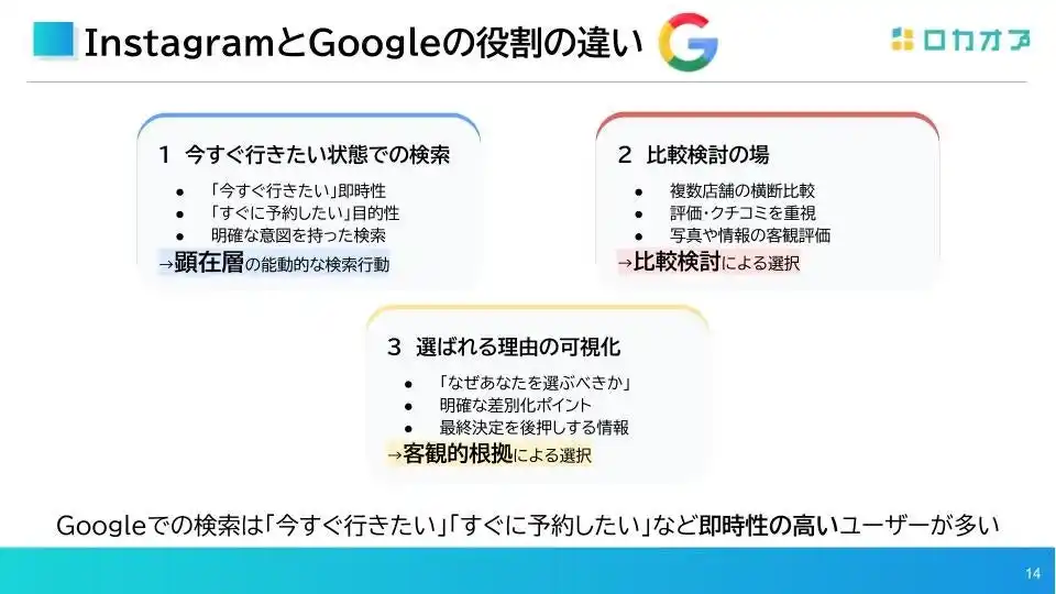 この違いを前提に、Instagramで関心を高め、Googleで判断材料を整えるという流れを意識することが、来店や予約につなげるための土台になることが示されました。 |