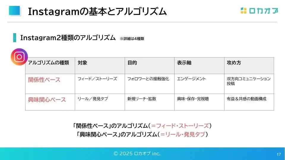 Instagramの投稿がどのような仕組みでユーザーに表示されるのかについて、基本的な考え方が整理されました。Instagramには主に2つのアルゴリズムがあり、フィードやストーリーズではフォロワーとの関係性を重視した表示が行われる一方、リールや発見タブでは興味関心に基づいた投稿が広く表示される仕組みになっています。 |