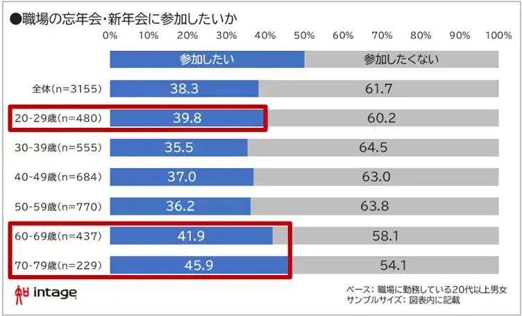 ・職場の忘年会・新年会に「参加したくない」は6割超。20代で参加希望者が平均を上回る |
