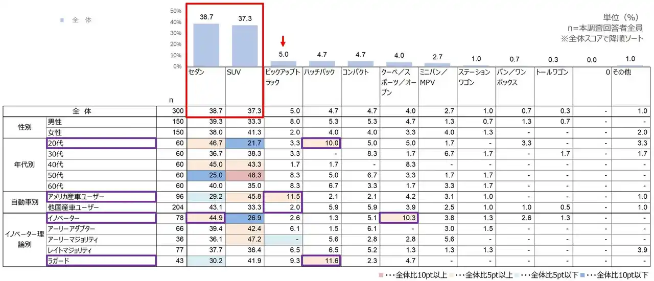 「セダン」「SUV」が共に4割弱を占め、この2タイプで市場の大半を構成している。「ピックアップトラック」は全体では5%にとどまる結果となった。 自動車別の【アメリカ産車ユーザー】においては、「ピックアップトラック」の保有率が約12%となり、他国産車ユーザー(2%)と比較して顕著に高い。全体の中では少数派ながら、自国の自動車文化を象徴するボディタイプとして根強く支持されているのかもしれない。