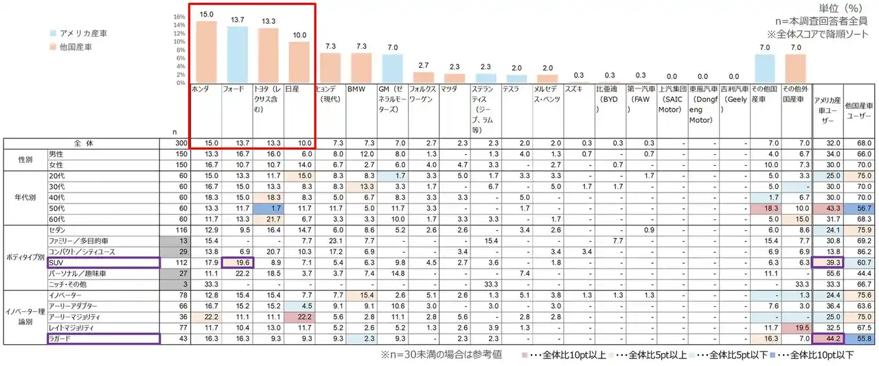 保有メーカーは「ホンダ」がトップ。次いで「フォード」が続き、以降は「トヨタ」「日産」と日本車メーカーが上位を占める結果となった。 ボディタイプ別の【SUV】では、「フォード」の比率が高く、他ボディタイプに比べると「アメリカ産車ユーザー」の比率が高い。 イノベーター理論別の【ラガード】は「アメリカ産車ユーザー」の比率が高い。【ラガード】にとって、アメリカ産の車は新奇性よりも”馴染みのあるブランド“として受容されている可能性が考えられる。 |