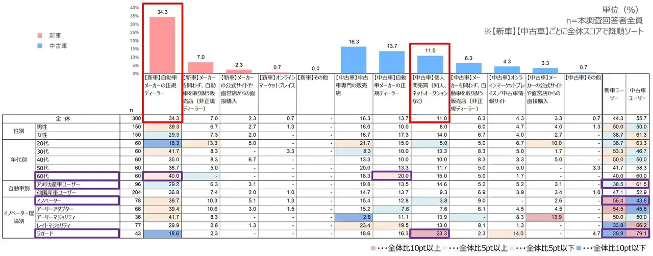 新車購入は「正規ディーラー」が圧倒的だが、中古車購入では「中古車専門販売店」を筆頭に、「正規ディーラー」や「個人間売買」などチャネルが分散している。特に「個人間売買」が約1割と一定のシェアを持つ点は特徴的である。 年代別の【60代】は新車・中古車を問わず「正規ディーラー」を利用する傾向が強く、『事前に情報取集にて』の店舗スタッフ情報の重視という結果とも合致する購買行動が見られる。 自動車別の【アメリカ産車ユーザー】は中古車の比率が高い。