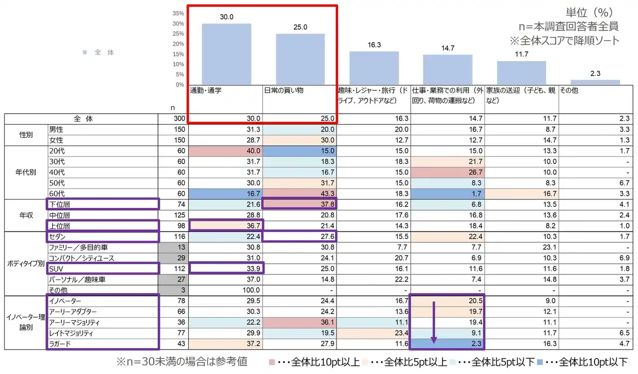 最多利用目的に絞ると「通勤・通学」がトップ。「日常の買い物」は2位へ後退となった。 年収の【上位層】は「通勤・通学」のスコアが他層より高い。 一方で、【下位層】では「日常の買い物」がトップと主用途の違いが表れている。 ボディタイプ別の【SUV】は「通勤・通学」を主目的とする割合が最も高い。 【セダン】は「仕事・業務での利用」が他タイプと比べて高いスコア。 選択肢の「仕事・業務での利用」に着目すると、【イノベーター】のスコアが最も高く、【ラガード】に向かうにつれてスコアが低下する傾向にある。 |
