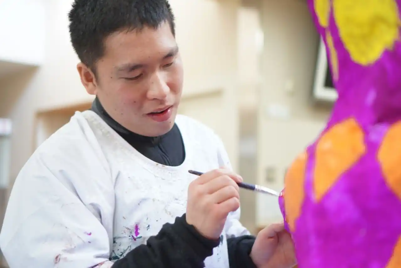 彼が計画する毎日の予定の中には、必ず創作活動が入っている。テーマも様々で動物や草花、風景や季節を表わすもの等、その日何を描くのかは彼のみぞ知るものである。始めに鉛筆でラフのように簡単に下描きをされ、その後はクレヨンや絵の具で力強く色鮮やかに塗り込まれていく。また絵画と合わせて彼の作風がそのまま作品から飛び出したかのように紙を丸めて形作り、様々な動物等を制作され、模様のように独特な色使いで着色されて完成していく。活発で元気、何事にも全力で取り組まれる彼の人柄が生み出す全ての作品に表出されている。 |