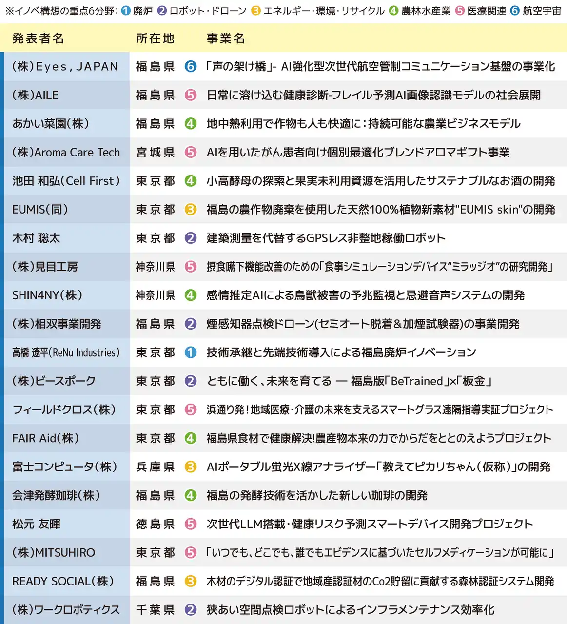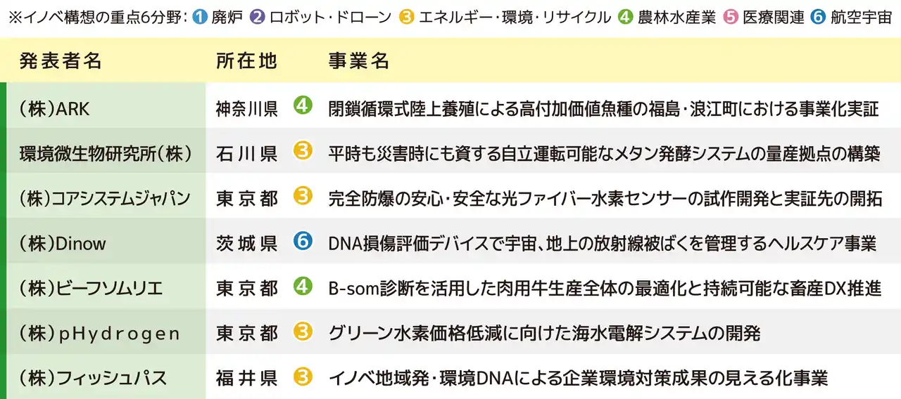 | 福島イノベ地域(※1)における起業や新事業展開を目指す企業・個人を支援する3つの事業プログラム(ビジネスアイデア事業化プログラム、アクセラレーションプログラム、先導技術事業化アクセラレーションプログラム)の、令和7年度採択者全37社(者)がそれぞれの事業内容やプログラムの成果を発表します。 | |||
